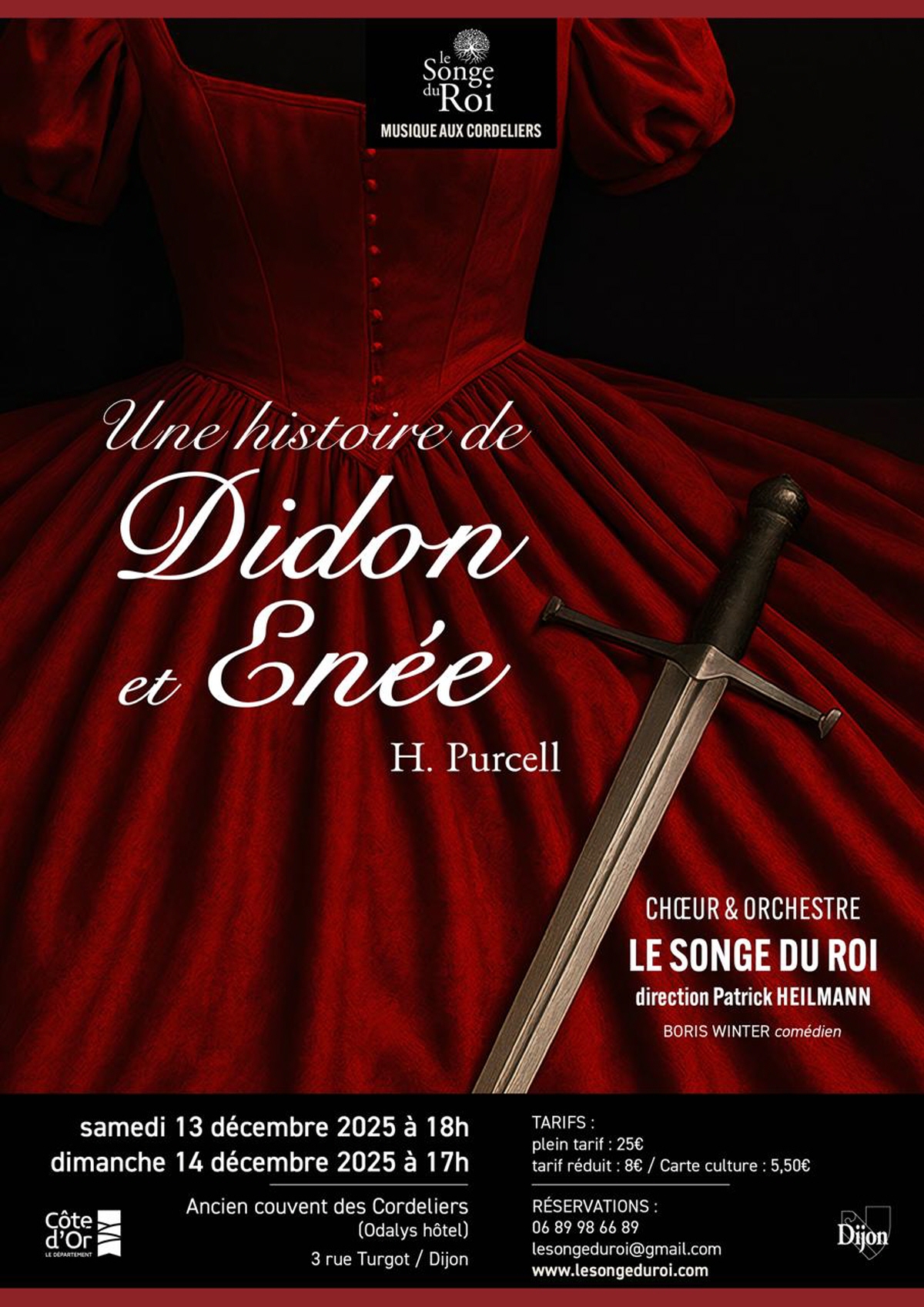 C’est en annonçant « Une histoire de Didon et Enée » que l’ensemble baroque Le Songe du Roi, de Patrick Heilmann, nous invite à venir écouter ses deux prochains concerts les samedi 13 et dimanche 14 décembre dans l’ancienne chapelle du Couvent des Cordeliers, rue Turgot, à Dijon.
